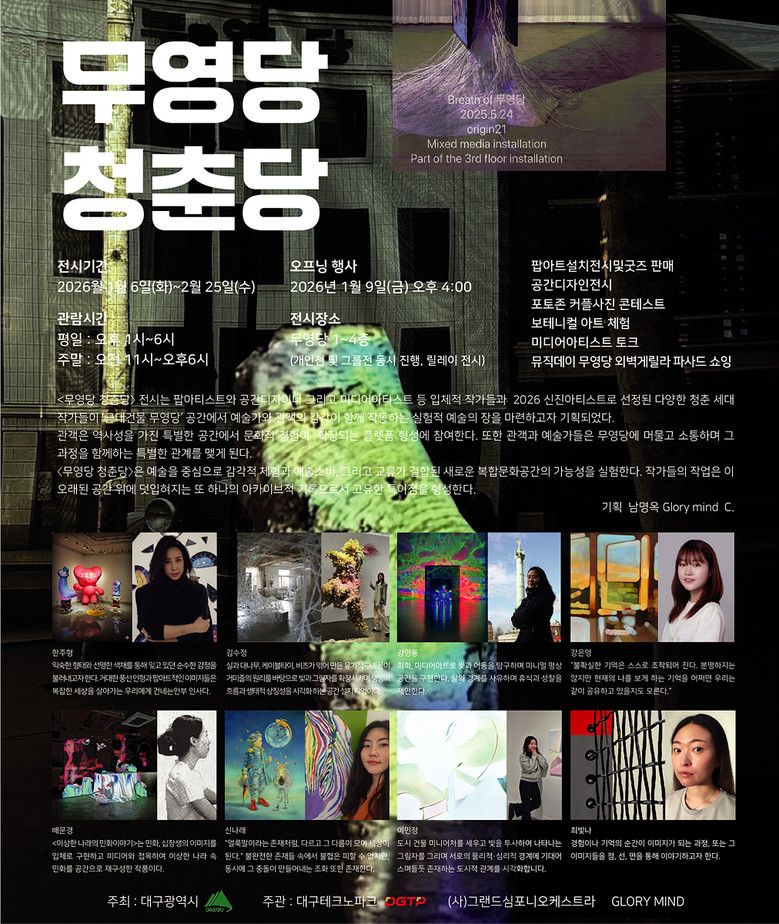 이번 ‘무영당 청춘당’ 전시는 대구시와 지역 문화예술가와의 협업을 통해 2026년 신진 아티스트로 선정된 청춘 세대 작가들이 무영당이라는 공간을 매개로 만나 교류하는 실험적 예술의 장으로 기획됐다. 예술가와 관객의 감각이 함께 호흡하는 새로운 전시 경험을 제안한다.