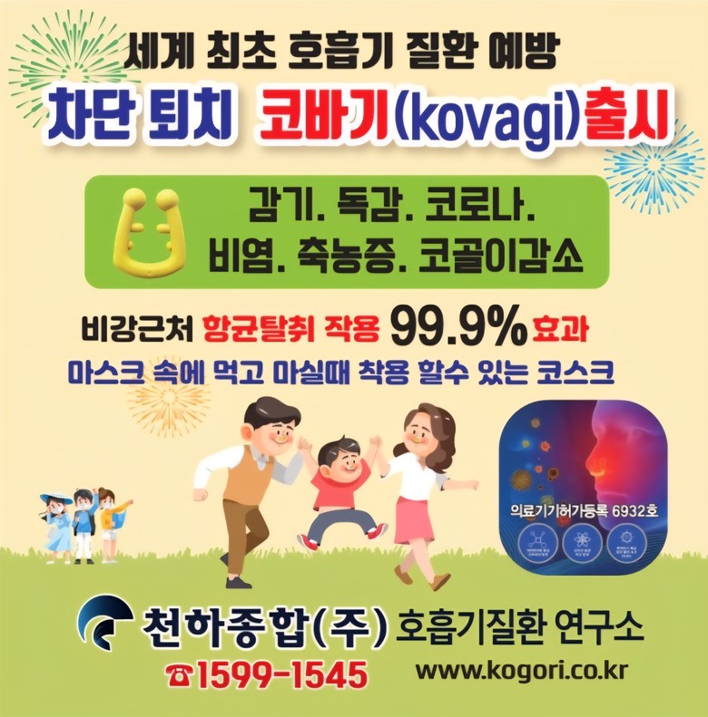 ‘코바기’는 감기, 독감, 각종 전염병 예방에 효과를 목표로 개발된 제품으로, 전북대학교 인수공통전염병연구소의 시험 결과 **코로나19 항바이러스 소멸효과 97.8% (in vitro, 24시간 기준)**를 확인했다.