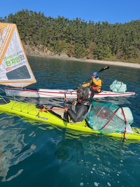 이날 참석자들은 섬과 해안, 해안 절벽 등 해식지형에 접안이 용이한 카약과 스탠드업패들보드(SUP)를 활용해 신진항에서 갈음이해수욕장, 마도 일원까지 해양플라스틱을 수거했다.