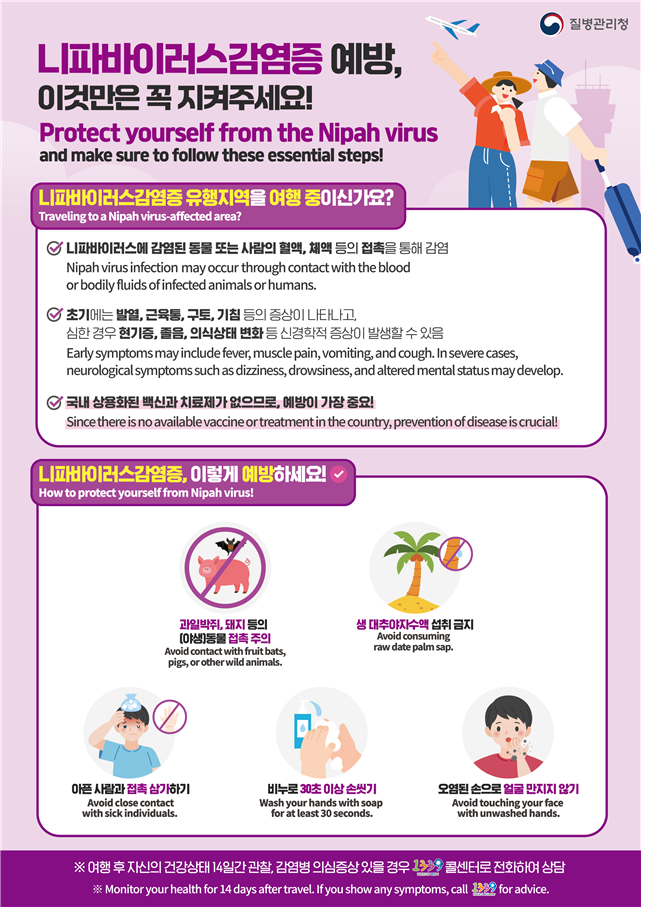 * 니파바이러스감염증 : 감염된 동물(과일박취, 돼지 등)과 접촉하거나 오염된 식품(대추야자수액 등)을 섭취할 경우 감염될 수 있으며, 치명률이 40~75퍼센트(%)로 높고 백신.치료제가 없는 위험한 질병으로 현재 1급 법정감염병으로 공식 지정