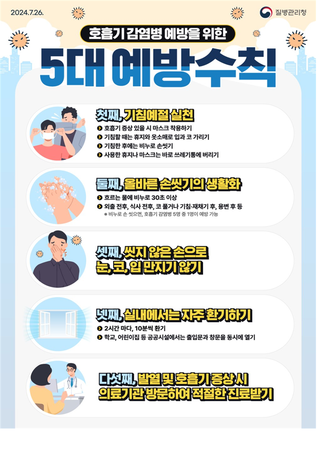 호흡기감염병 예방을 위한 5대 예방 수칙으로 ▲기침예절 실천 ▲올바른 손 씻기 생활화 ▲씻지 않은 손으로 눈·코·입 만지지 않기 ▲실내에서는 자주 환기하기 ▲발열 및 호흡기 증상 시 의료기관을 방문해 적절한 진료받기 등이 있다.