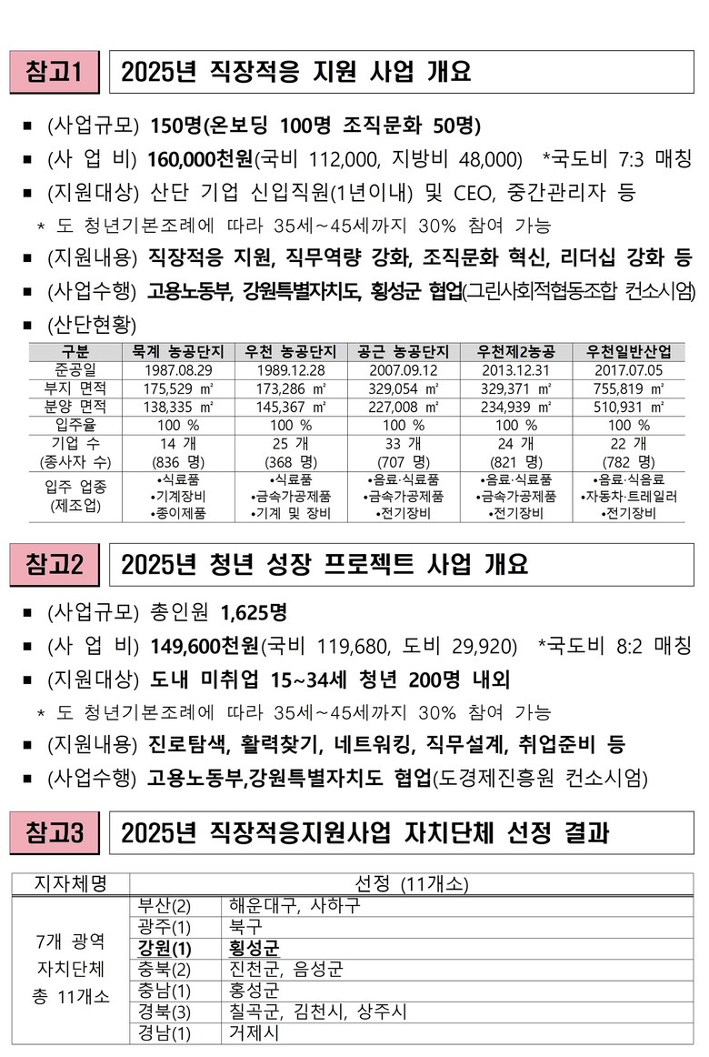 이번 사업은 횡성군 내 5개 산업단지 인원을 대상으로, 온보딩 교육(상사와의 대화방법, 직무역량 강화, 멘토링 등), 조직문화 교육(청년세대 이해 및 소통방법, 리더십 문화) 등 5월부터 다양한 프로그램을 지원할 계획이다.