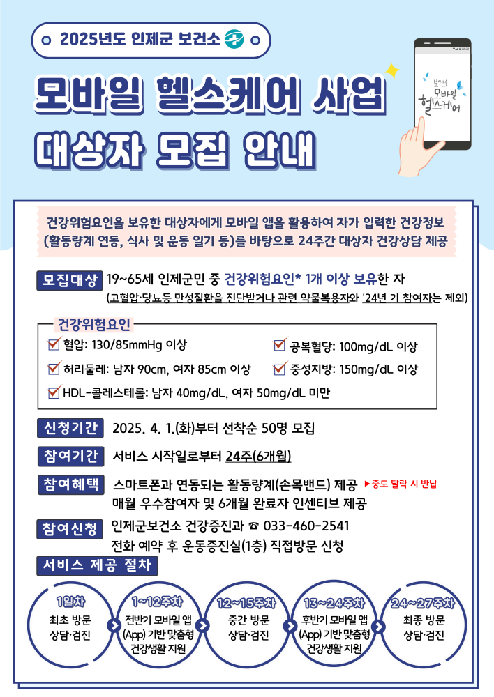 참여를 희망하는 주민은 보건소에 직접 방문해 신청 및 사전 상담, 검진을 진행하면 된다. 이후 혈압, 혈액, 인바디 검사 결과에 따라 최종 대상자로 선정되면 목표를 설정한 후 스마트폰 ‘모바일 헬스케어’ 앱을 통해 활동량과 건강을 관리하면 된다. 더욱 자세한 내용은 인제군보건소 건강증진과 건강관리팀에 문의하면 된다.