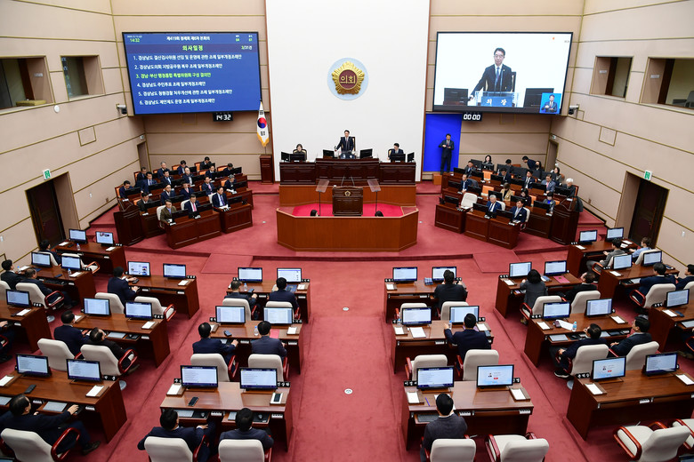 이어, ‘경상남도 결산검사위원 선임 및 운영에 관한 조례 일부개정조례안’ 등 조례안 23건, ‘원전산업 지원에 관한 특별법 제정 촉구 대정부 건의안’ 등 건의안 3건, ‘경남.부산 행정통합 특별위원회 구성 결의안’ 등을 처리하고,