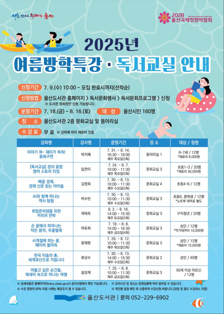 7월 9일부터 도서관 누리집 통해 선착순 모집 [울산 세계타임즈=이호근 기자] 울산도서관은 오는 7월 18일부터 8월 16일까지 ‘2025년 여름방학특강·독서교실’을 운영한다고 밝혔다.