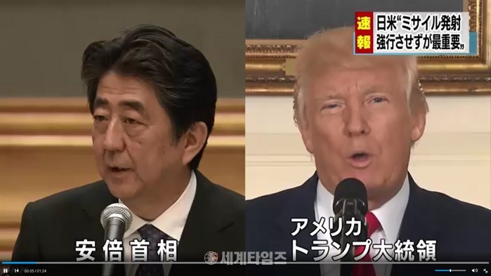 [세계타임즈 이흥수기자]도널드 트럼프 미국 대통령과 아베 신조(安倍晋三) 일본 총리는 3일 다시 긴급 전화회담을 갖고 미사일 발사 도발 등에 대한 대응책을 협의했다.