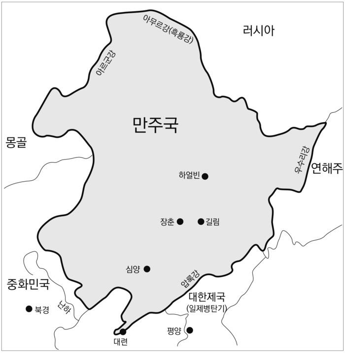 일본은 만주를 차지하기 위한 방법 중 하나로 만주국 건립을 끈질기게 추진했고 그 결과 만주국을 건국하였는데 그 영역이 대한제국의 선조들인 고조선이 지배했던 영역과 비슷하다. 그러한 만주국의 지리적인 특징은 아래 지도를 보면 쉽게 이해할 수 있다.