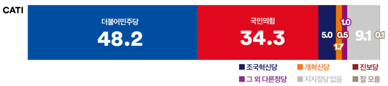 [세계타임즈 = 심귀영 기자] ‘여론조사꽃’이 2025년 2월 7일부터 2월 8일까지 이틀간 실시한 전화면접조사에서 ‘더불어민주당’의 지지율은 48.2%로 직전 조사 대비 2.2%p 하락한 것으로 나타났다. 반면, ‘국민의힘’은 34.3%로 변동이 없었으며, ‘조국혁신당’의 지지율은 5.0%로 1.5%p 상승한 것으로 조사됐다. 양당 간 격차는 13.9%p로 집계됐으며, ‘더불어민주당’과 ‘조국혁신당’의 합산 지지율(53.2%)은 ‘국민의힘’(34.3%)보다 18.9%p 앞서는 결과를 보였다.