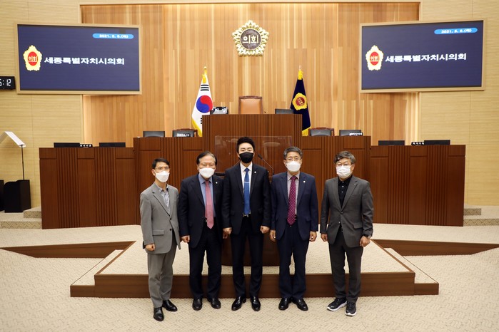 | ▲ 왼쪽부터 세종시의회 산업건설위원회 이재만 전문위원, 옥천군의회 곽봉호 의원, 세종시의회 임채성 산업건설위원장, 옥천군의회 추복성 의원, 옥천군의회 산업경제전문위원실 직원. |