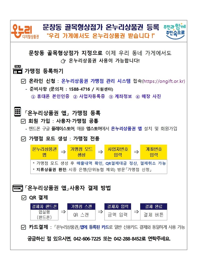 온누리상품권 가맹점 등록은 점포별로 개별 신청해야 하나, 문창동에서는 가맹점 등록 안내 매뉴얼과 출력물을 상인들에게 제공하고 모바일 소통 채널 안내를 병행하는 등 현장 중심의 지원을 실시했다.