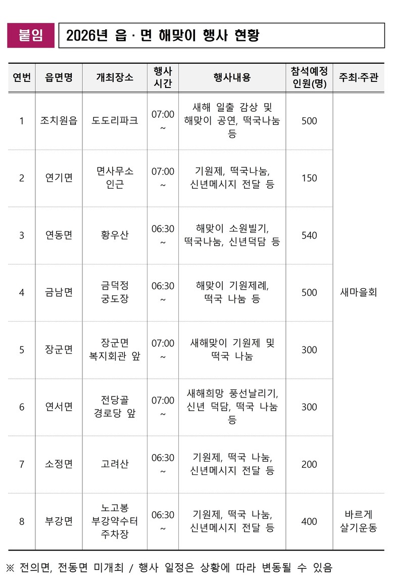 한편 해맞이 행사는 세종호수공원 이외에도 조치원읍 도도리파크, 연기면 행정복지센터, 연동면 황우산, 금남면 금덕정, 장군면 복지회관, 연서면 전당골 경로당, 소정면 고려산, 부강면 노고봉 정상 등 세종시 곳곳에서 열릴 예정이다.