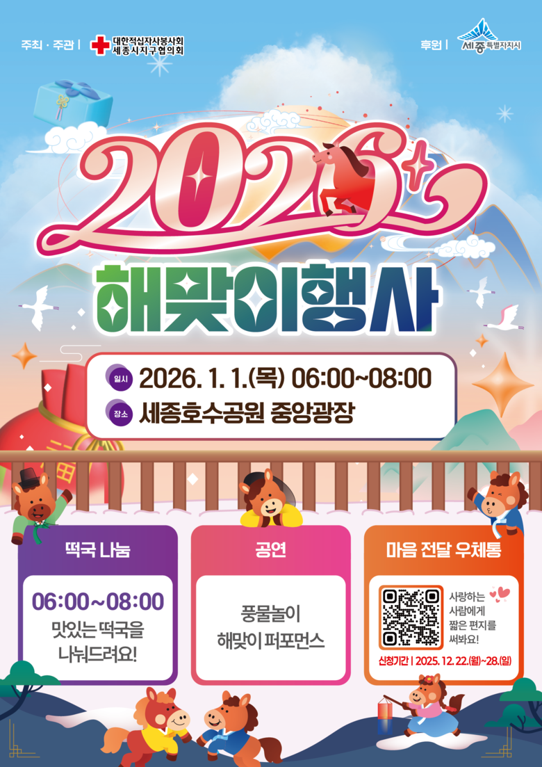 이번 해맞이 행사는 대한적십자사봉사회 세종시지구협의회 주관으로 2026년 1월 1일 오전 6시부터 시작한다.