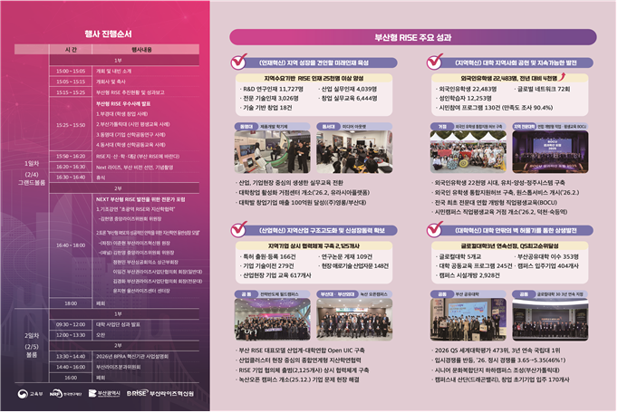 둘째 날에는 ▲대학별 1차 년도 라이즈 성과 발표 ▲지역혁신기관별 연계·협력사업 설명회 ▲부산라이즈 분과위원회 회의가 이어지며, 부대·연계행사로 부울경 대학생들이 모여 부산이라는 주제로 게임·웹툰·관광·디자인 콘텐츠를 제작·발표하는 부산 콘텐츠 경진대회(동서대학교 주관)도 진행된다.