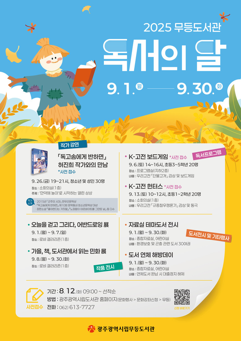 무등도서관은 9월 1일부터 어반드로잉, 민화 작품 갤러리 전시와 자료실 테마도서 전시를 시작으로 ▲9월 6·13일 K-고전 특강(초등학생 대상) ▲9월26일 허진희 작가 강연 ‘만약에 놀이로 시작하는 열린 상상’ 등 7개 프로그램을 준비했다.