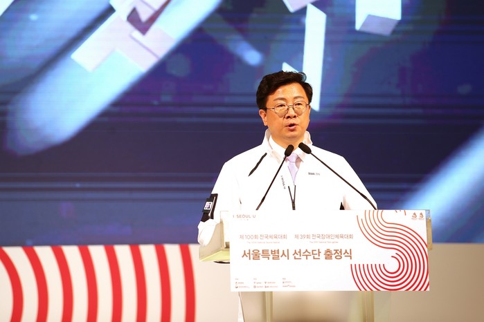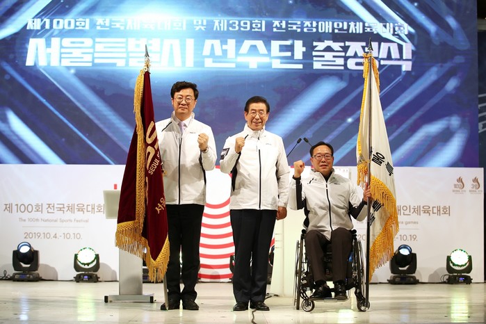 서울특별시체육회(회장 박원순)가 26일 저녁 7시 서울광장에서 열린 제100회 전국체육대회 및 제39회 전국장애인체육대회 서울시 선수단 출정식에서 선수단복을 공개했다.