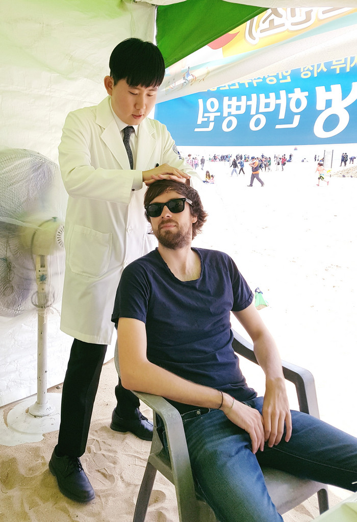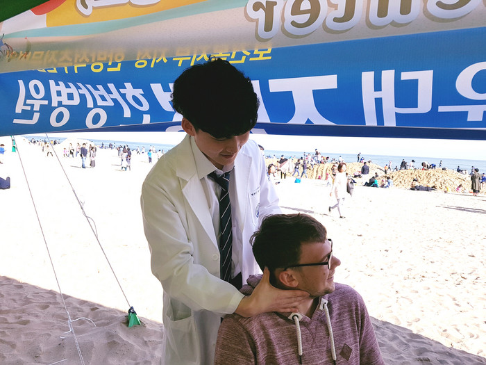 | ▲해운대자생한방병원 의료진이 지난 19일부터 열린 ‘2018 해운대 모래축제’에서 외국인 관광객을 대상으로 추나요법을 선보이고 있다. |