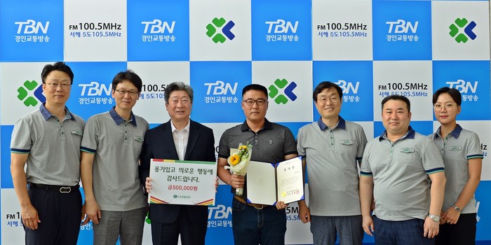 | ▲ 2일 인천 남구 TBN경인교통방송에서 윤종기 도로교통공단 이사장(왼쪽)이‘투스카니 의인’ 한영탁씨(오른쪽)에게 감사장을 전달 후 기념촬영을 하고 있다. |