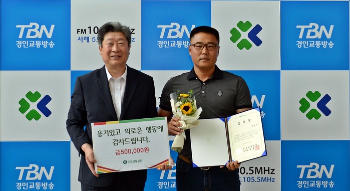 도로교통공단(이사장 윤종기)은 2일 인천 남구 TBN경인교통방송 회의실에서 최근 고속도로 주행 중 위험을 무릅쓰고 고의사고를 일으켜 대형 교통사고 예방에 기여한 ‘투스카니 의인(義人)’ 한영탁씨(46)에게 감사장을 전달했다.