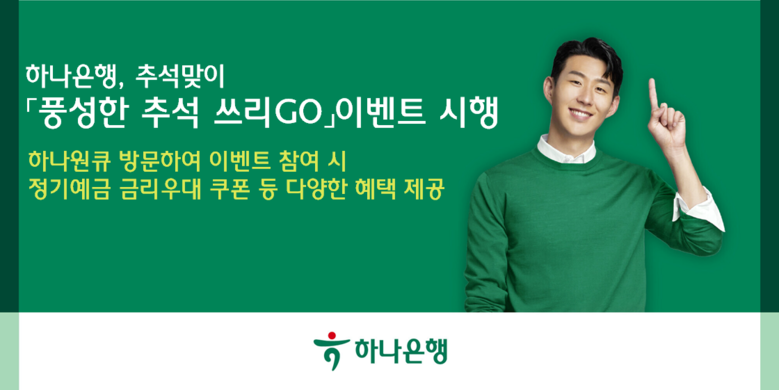 오는 10월 20일까지 진행되는 맞아 『풍성한 추석 쓰리GO』 이벤트는 손님에게 감사의 마음을 담아 금리 우대 쿠폰 받GO, 정기예금 가입하GO, 하나머니 받GO 등 보름달처럼 풍성한 혜택을 제공 한다는 의미로 기획 되었으며, 은행의 대표 모바일 앱인 ‘하나원큐’ 내 이벤트 페이지 통해 손님 누구나 참여가 가능하다.