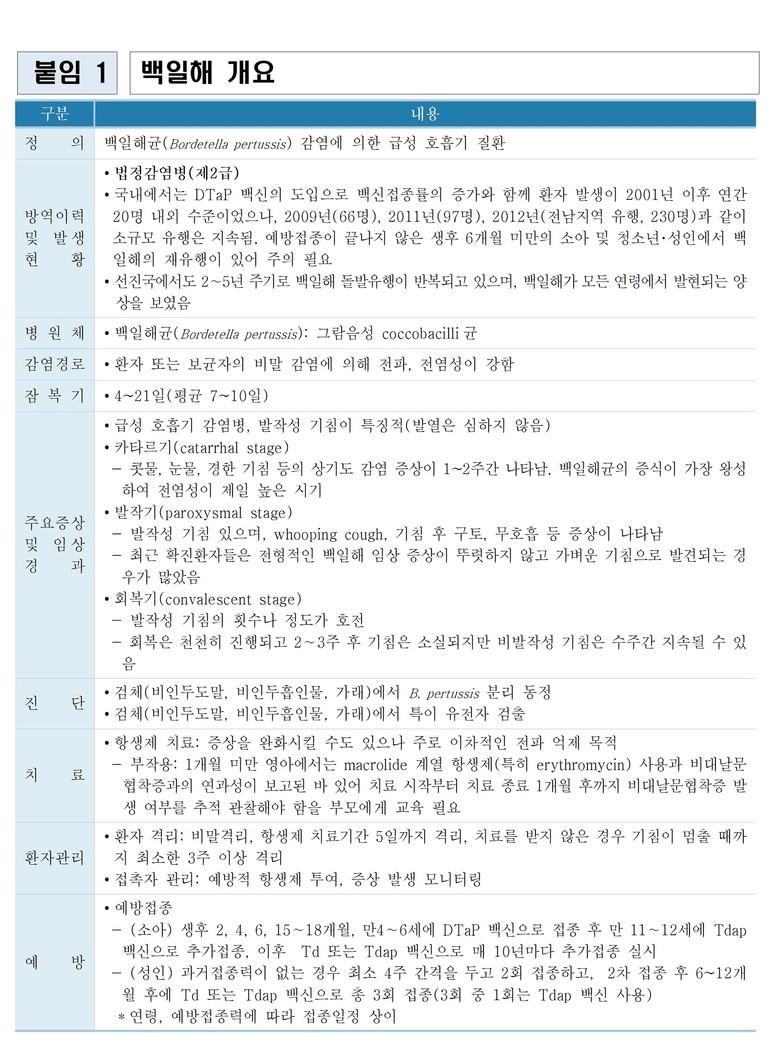 백일해는 보르데텔라 균(Bordetella pertussis)에 의해 발생하는 2급 법정 호흡기 감염병으로 발작성 기침과 기침 후 구토, 무호흡 등의 증상을 특징으로 하며, 환자가 기침 또는 재채기할 때 튀어나온 비말을 통해 전파된다.