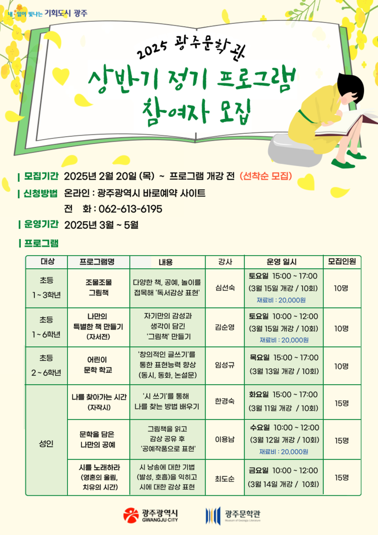 김성배 문화체육실장은 “광주문학관의 다양한 문학프로그램을 통해 시민이 문학과 더욱 가까워지고 창작의 즐거움을 경험할 수 있을 것”이라며 “시민들의 많은 관심과 참여를 바란다”고 말했다.