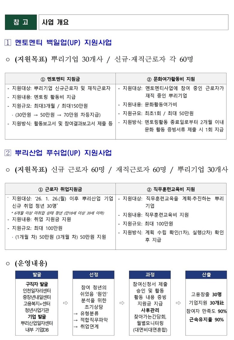 신규 입사자와 멘토로 참여하는 재직 근로자에게는 3개월간 최대 150만 원의 지원금이 지급되며, 신규 입사자가 100일 근속을 달성한 기업에는 문화·여가 활동비가 지원된다.