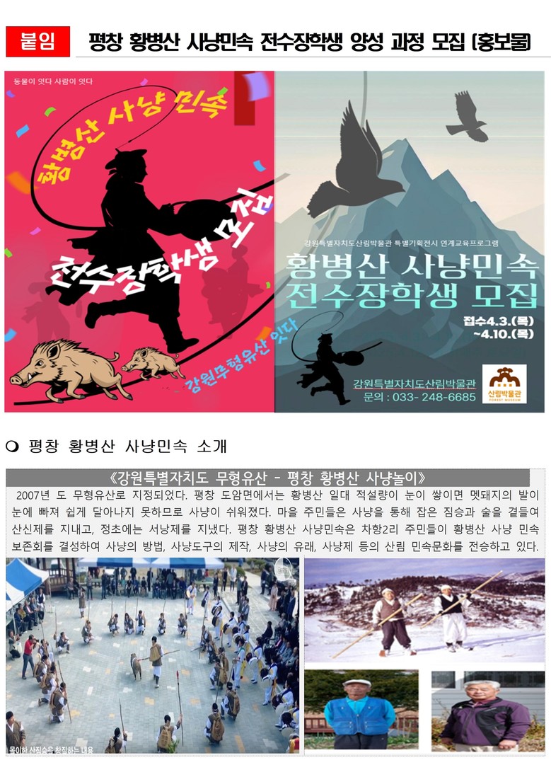 강원특별자치도산림박물관은 이번 공모에 선정되어, 기획전시 『동물이 잇다, 사람이 잇다』 와 연계한 교육프로그램인 『평창 황병산 사냥민속 전수장학생 양성』 을 위한 사업비를 지원받는다.