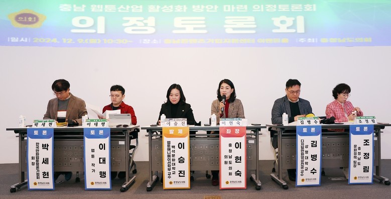 이번 토론회는 충남도의회 이현숙 의원(비례·국민의힘)이 좌장을 맡아 진행했으며, 이승진 백석문화대학교 웹툰애니메이션학부 교수가 주제 발표를 맡았다. 토론자로는 김병수 상명대학교 교수, 박세현 한국만화웹툰평론가협회장, 이대행 웹툰작가, 조정림 충청남도 문화산업팀장이 참여해 다양한 의견을 제시했다.