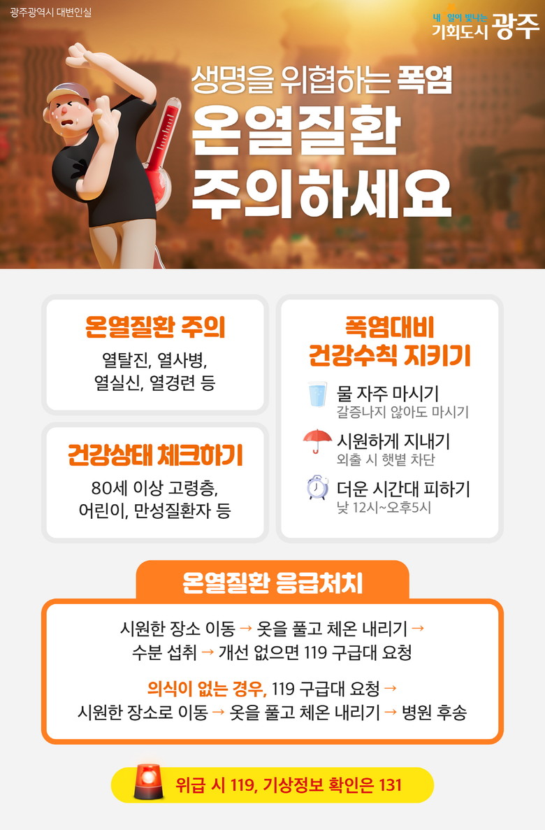 광주광역시(시장 강기정)는 지난 5월 20일부터 온열질환자를 관리하기 위해 응급실 운영 의료기관 26곳을 통해 온열질환자 발생 현황을 확인하는 ‘온열질환 응급실 감시체계’를 운영하고 있다.