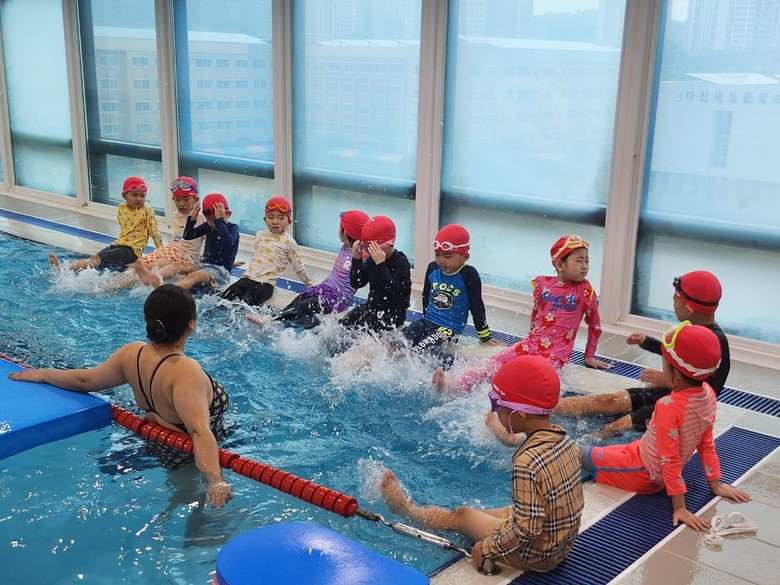 유아들은 물에 적응하기 위해 풀 사이드를 잡고 한 줄로 서서 수영장 끝까지 걸어갔다 오는 연습을 했으며, 얕은 풀을 이용하여 물속에서 여러 가지 동작을 시도해보았다. 또한 풀 사이드에 걸터앉아 발차기 연습을 하고 보조기구를 이용하여 물에 뜨는 연습을 진행했다.