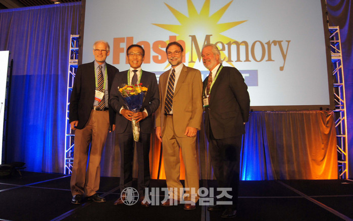10일(현지시각) 미국 산타클라라 컨벤션 센터에서 열린 '플래시 메모리 서밋 2016'에서 삼성전자 반도체총괄 김기남 사장이 플래시 메모리의 기술 발전과 시장 성장에 대한 공로를 인정받아 '평생 공로상'을 수상한 뒤 기념촬영을 하고 있다. 왼쪽부터 톰 코플린 Coughlin Associates,Inc. 대표 겸 FMS Conference Chairperson, 김기남 사장, 브라이언 버그 FMS Technical Chairperson, 짐 핸디 Objective Analysis Director, Chief Analyst. 2016.08.11. (사진=삼성전자 제공)