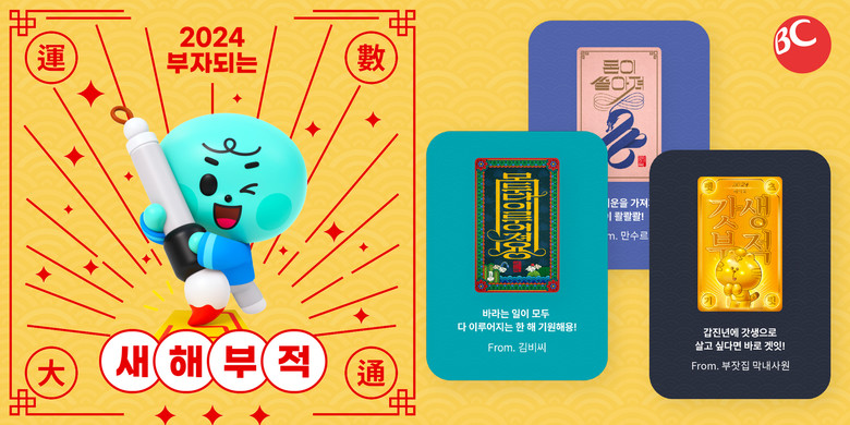 이번 이벤트는 29일까지 BC카드 생활금융플랫폼 ‘페이북’ 앱에서 진행된다. BC카드 고객은 6개 디지털 부적(성공·부자·행운·복·소망·만사형통) 디자인 중 한 개를 선택해 메시지를 적어 가족, 친구 등에게 보내면 된다.