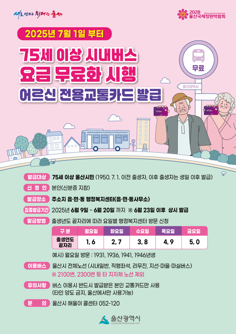 어르신 시내버스 요금 무료화 사업은 울산시의 민선 8기 후반기 역점 시책인 ‘울부심 생활+ 사업’의 하나로 추진된다. 울산을 산업수도로 이끈 산업역군을 예우하고, 요금 부담을 덜어 대중교통 이용을 활성화하기 위해 마련됐다.