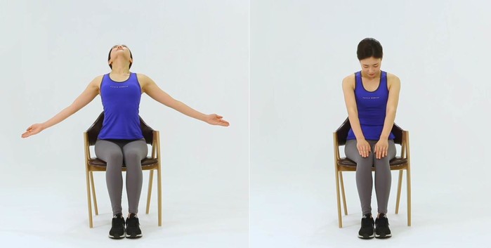 우선 양팔을 천천히 좌우로 벌리면서 가슴은 활짝 펴고 고개를 뒤로 젖힌다. 이후 고개를 앞으로 숙이며 양손은 무릎 위에 모으는 동작을 취하면 된다. 이를 5회 반복하면 된다. 이때 주의사항은 팔을 벌릴 때 가슴을 위로 내밀어주는 것이다. 고개는 살짝만 숙인다. [세계타임즈 조원익 기자]