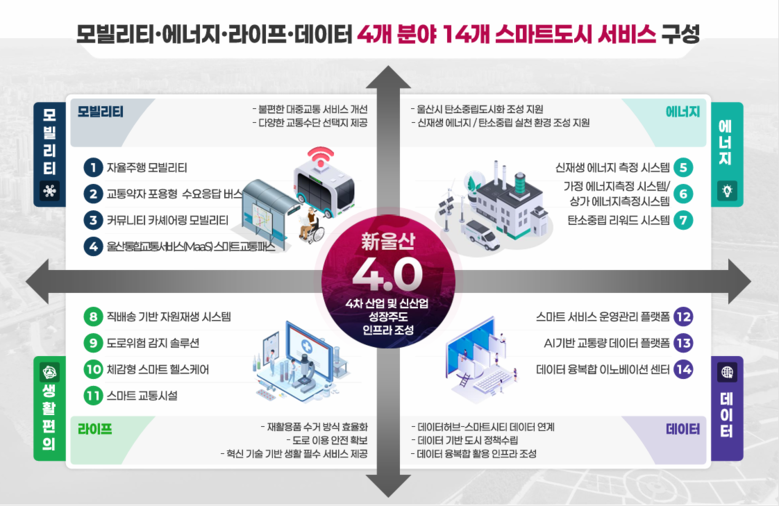 ‘울산시 거점형 지능형도시(스마트시티) 조성사업’은 지능형도시(스마트시티) 기술을 활용해 지역 경쟁력을 강화하고, 지능형도시(스마트시티) 서비스 확산을 위한 거점 조성을 목표로 한다.