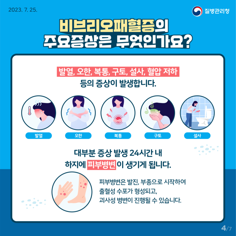 비브리오패혈증은 비브리오패혈증균(Vibrio vulnificus) 감염에 의한 급성 패혈증으로 주로 해산물을 날로 섭취 또는 덜 익혀서 먹는 경우와 상처 난 피부가 오염된 바닷물과 접촉할 경우 감염된다.