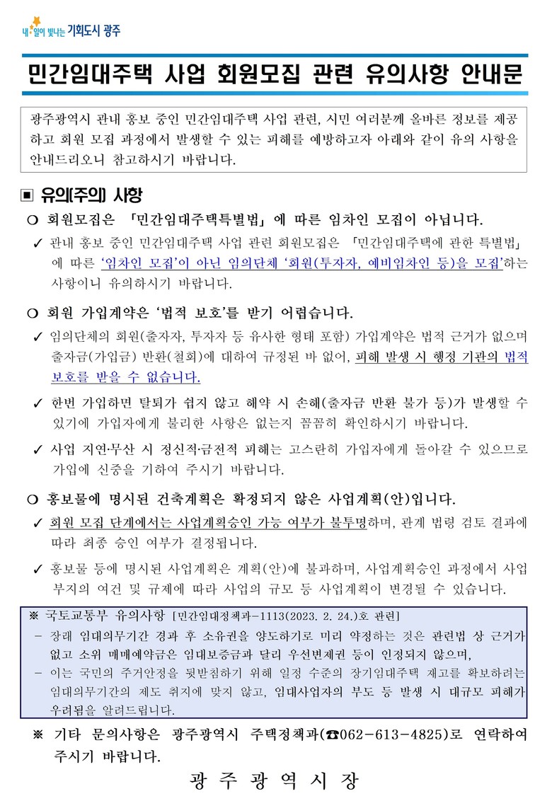 광주시는 시민 피해를 예방하기 위해 ‘민간임대주택 회원모집 관련 유의사항 안내문’을 해당 홍보관에 배포하고 투자주의 현수막을 설치하는 등 적극 대응하고 있다. 또 위반사항이 적발되면 관할 자치구와 협력해 행정조치를 취할 방침이다.