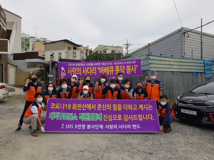 [대전=세계타임즈 이채봉 기자] 9천명 SNS 대전시 봉사단체 사랑의 사다리 밴드(리더 이정제)는 지난29일 오후4시,코로나 19 최전선에서 애쓰고 있는 대덕구 보건소 100명의 직원들에게 바비큐 통닭 50마리 봉사로 우리 사회의 따뜻한 사랑을 전달 하였다.