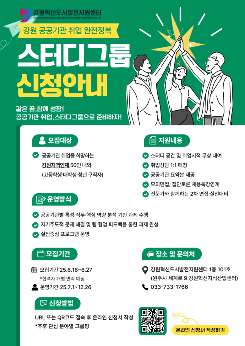 - 필기·면접 대비 그룹 학습, 현직자 멘토링, 공간 제공 등 실질적 취업 지원 [강원도 세계타임즈=김민석 기자] 강원혁신도시발전지원센터(센터장 장유진)는 원주시 교육발전특구 위탁사업의 일환으로, 원주권 지역인재의 정보 접근성을 높이고 공공기관 취업을 체계적으로 준비할 수 있도록 7월부터 12월까지 ‘공공기관 취업 지원 스터디그룹’을 운영한다.