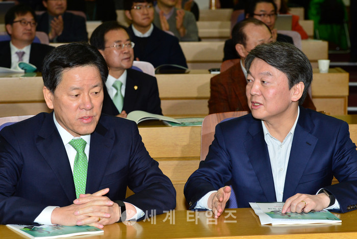 안철수 국민의당 전 대표가 21일 오전 서울 여의도 국회 의원회관에서 열린 '중소기업 경쟁력 강화를 통한 좋은 일자리 창출방안 모색' 토론회에 참석하여 일자리 정책 공약 발표에 앞서 주승용 국민의당 원내대표와 대화를 하고 있다. 2017.02.21.
