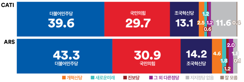 같은 기간 진행한 ARS조사 결과, ‘더불어민주당’은 지난주보다 2.2%p 상승한 43.3%, ‘국민의힘’은 1.5%p 상승한 30.9%로 양당 간 격차는 12.4%p로 조금 더 벌어졌다. ‘조국혁신당’은 2.6%p 하락한 14.2%를 얻었다.