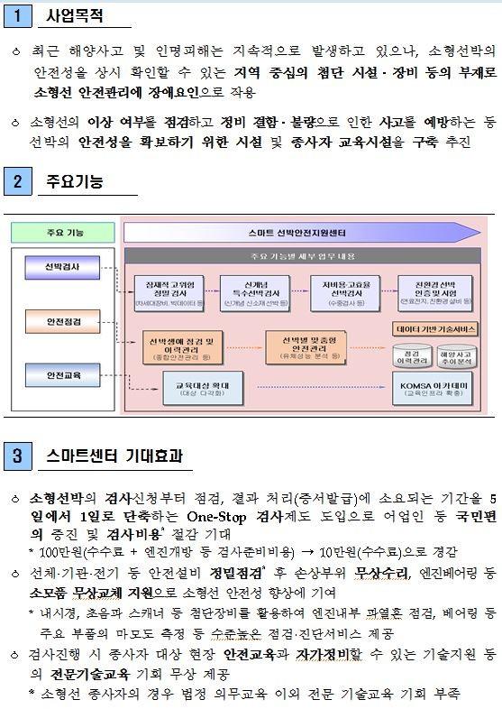 101억원 전액 국비로 건설될 인천 스마트 선박안전지원센터는 중소형 선박의 검사 및 안전점검과 선박 종사자 대상 해양안전교육 프로그램 운영을 함께 할 수 있는 복합시설로 최신 선박검사・안전점검 정비와 선박 종사자 교육시설 등을 갖추게 된다.