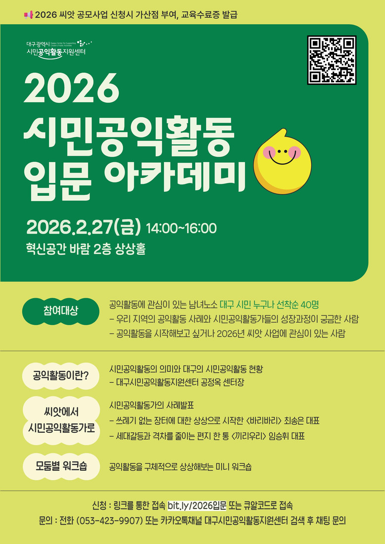 아카데미 관련 자세한 사항은 전화(☏ 053-423-9907) 또는 카카오톡 채널(대구광역시 시민공익활동지원센터)을 통해 문의하면 된다.