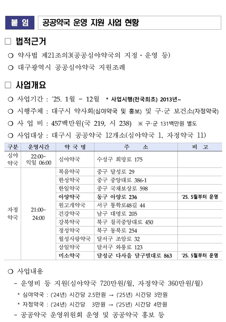 이번, 공공약국 확대 운영으로 심야시간에 운영하는 공공약국이 없던 동구에 아양약국과 달성군에 미소약국이 추가 운영된다.