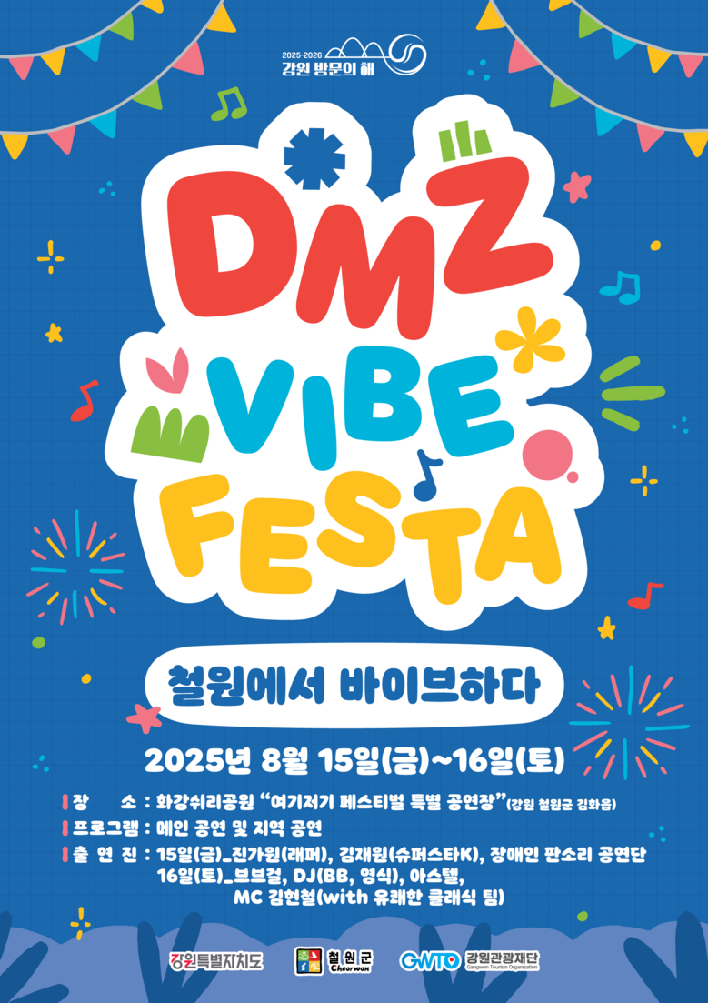 ‘2025-2026 강원 방문의 해’ 특별 기획으로, 국내 유일의 접경지역 음악 축제 ‘DMZ 바이브 페스타(VIBE FESTA)’가 첫선을 보인다. 70년 분단의 상징 DMZ를 젊은 세대를 위한 ‘감성 여행지’로 만들기 위해 강원특별자치도와 철원·화천·양구·인제 4개군, 강원관광재단이 뜻을 모았다. 그 첫 무대는 8월 15~16일, 철원 화강의 ‘여기저기 페스티벌’ 특별 공연장에서 열린다.