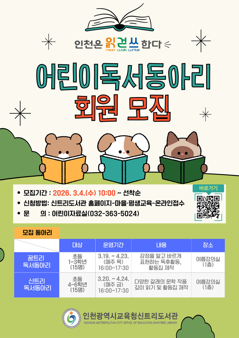 참여 신청은 신트리도서관 누리집에서 3월 4일 오전 10시부터 선착순으로 진행되며, 자세한 내용은 신트리도서관 누리집을 참고하거나 어린이자료실(☎032-363-5024)로 문의하면 된다.