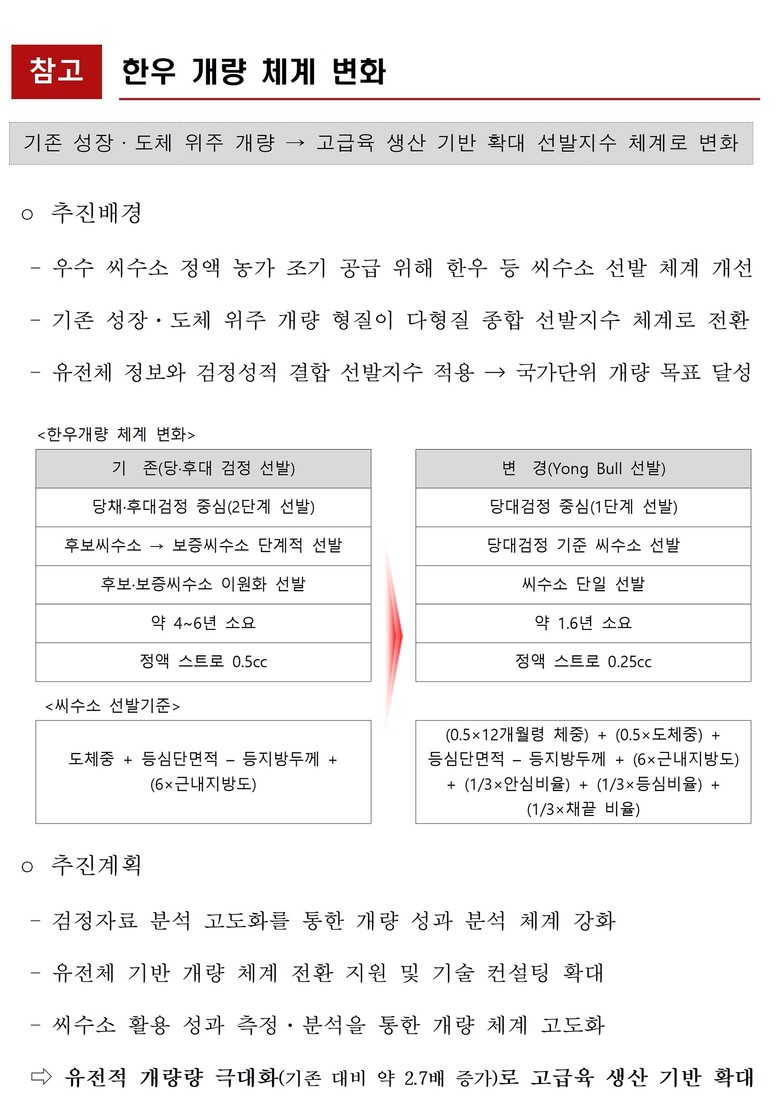강원특별자치도 박형철 농정국장은 “국가 한우 개량체계 전환 흐름에 맞춰, 변화된 제도가 도내 육종농가 현장에 안착되길 바란다”며, “앞으로도 한우 개량정책 변화에 맞춰 농가가 충분히 이해하고 활용할 수 있도록 맞춤형 교육과 지원을 아끼지 않겠다”고 밝혔다.