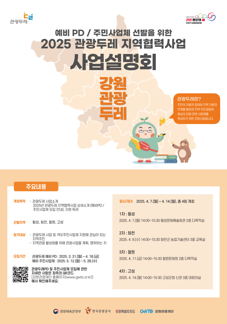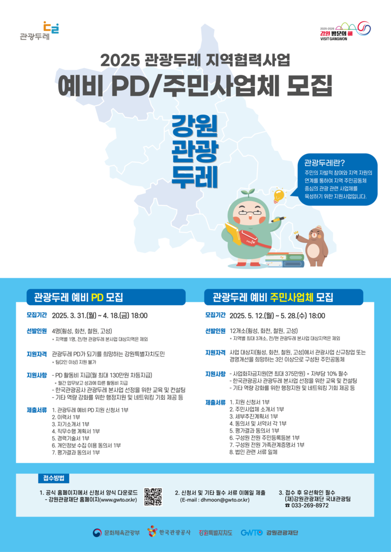 예비 PD는 강원특별자치도에 거주하며 관광두레에 관심이 있는 누구나 지원할 수 있으며, 선발 규모는 각 모집 지역별 1명씩 총 4명이다. 예비 PD는 4월 18일까지 모집을 한다. 자세한 내용은 강원관광재단 홈페이지(https://www.gwto.or.kr)에서 확인할 수 있다.