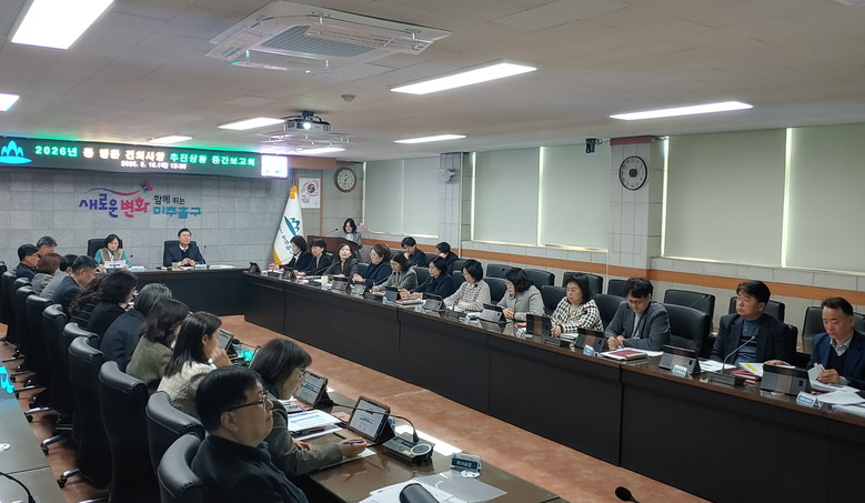 [미추홀구 세계타임즈=심하린 기자] 인천 미추홀구(구청장 이영훈)는 지난 19일 구청 중회의실에서 간부 공무원 등 40여 명이 참석한 가운데, ‘2026년 동 방문 구민 공감, 소통 도시 미추홀구 건의 사항 중간 보고회’를 개최했다.