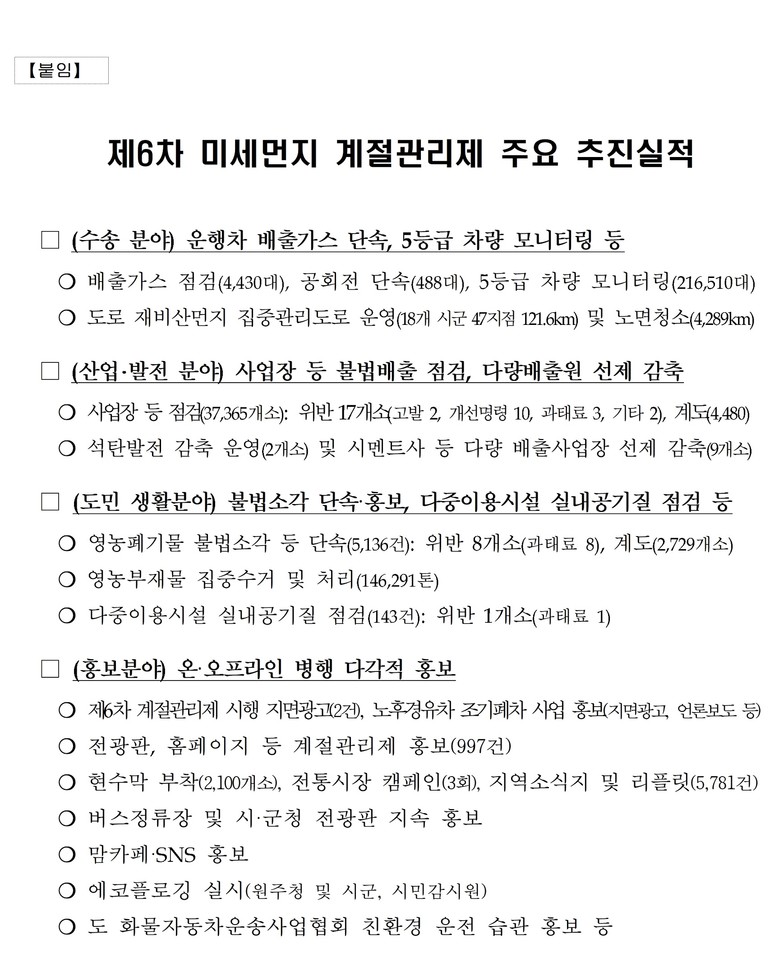 도는 고농도 미세먼지 집중 발생 시기인 지난 4개월 동안 도민 건강 보호를 위해 수송, 산업·발전, 생활 등 3개 분야에 걸쳐 강화된 저감대책을 집중 추진하였다.